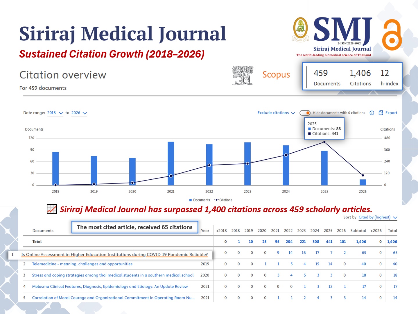 Siriraj Medical Journal – Sustained Citation Growth (2018–2026) Surpassing 1,400 citations across 459 scholarly articles | h-index: 12
